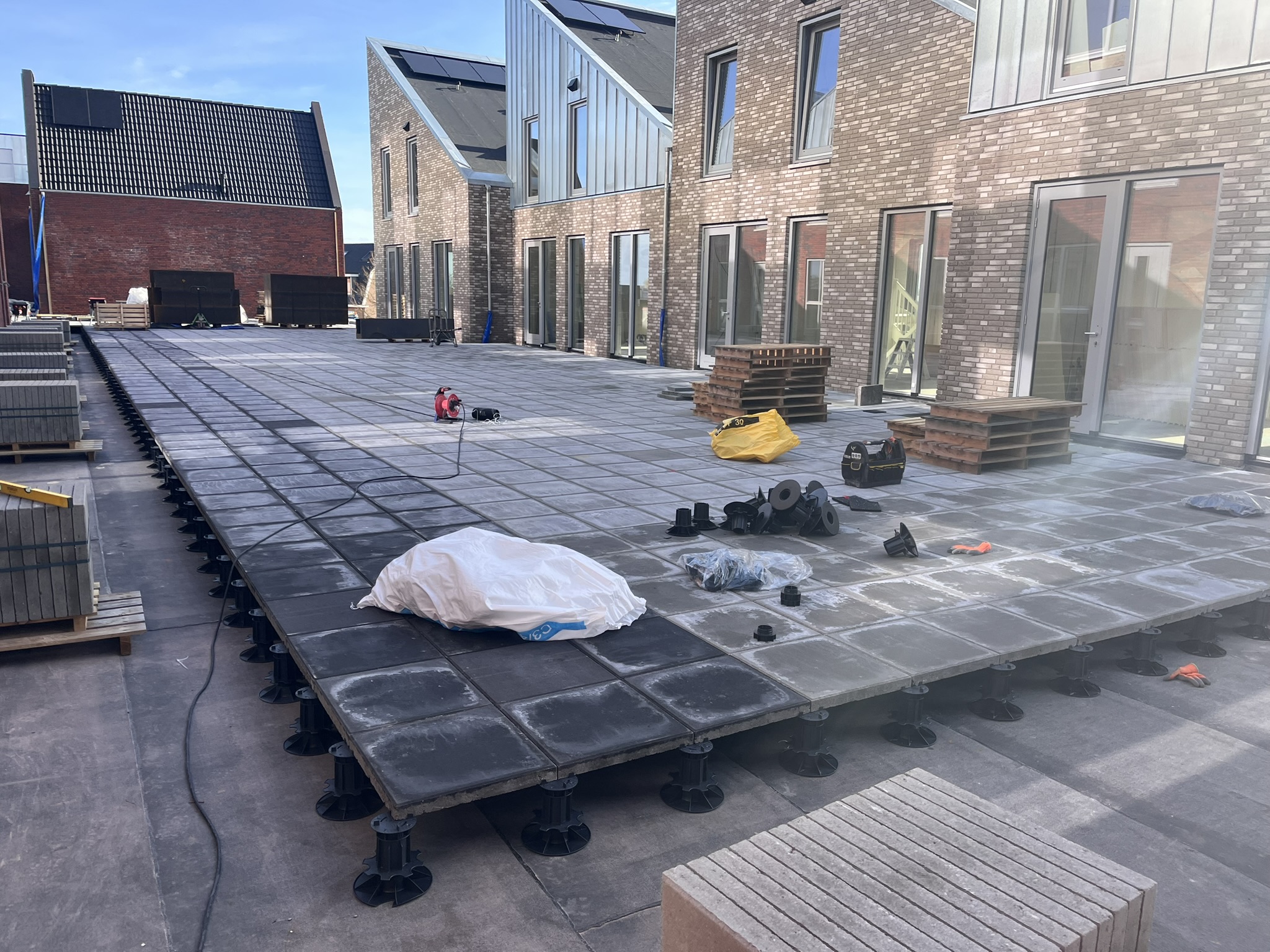 Voor hoofdaannemer Blokland brengen wij op dit moment ruim 1000m2 daktegels aan op verstelbare tegeldragers. Project: Nieuwe Haven Streefkerk